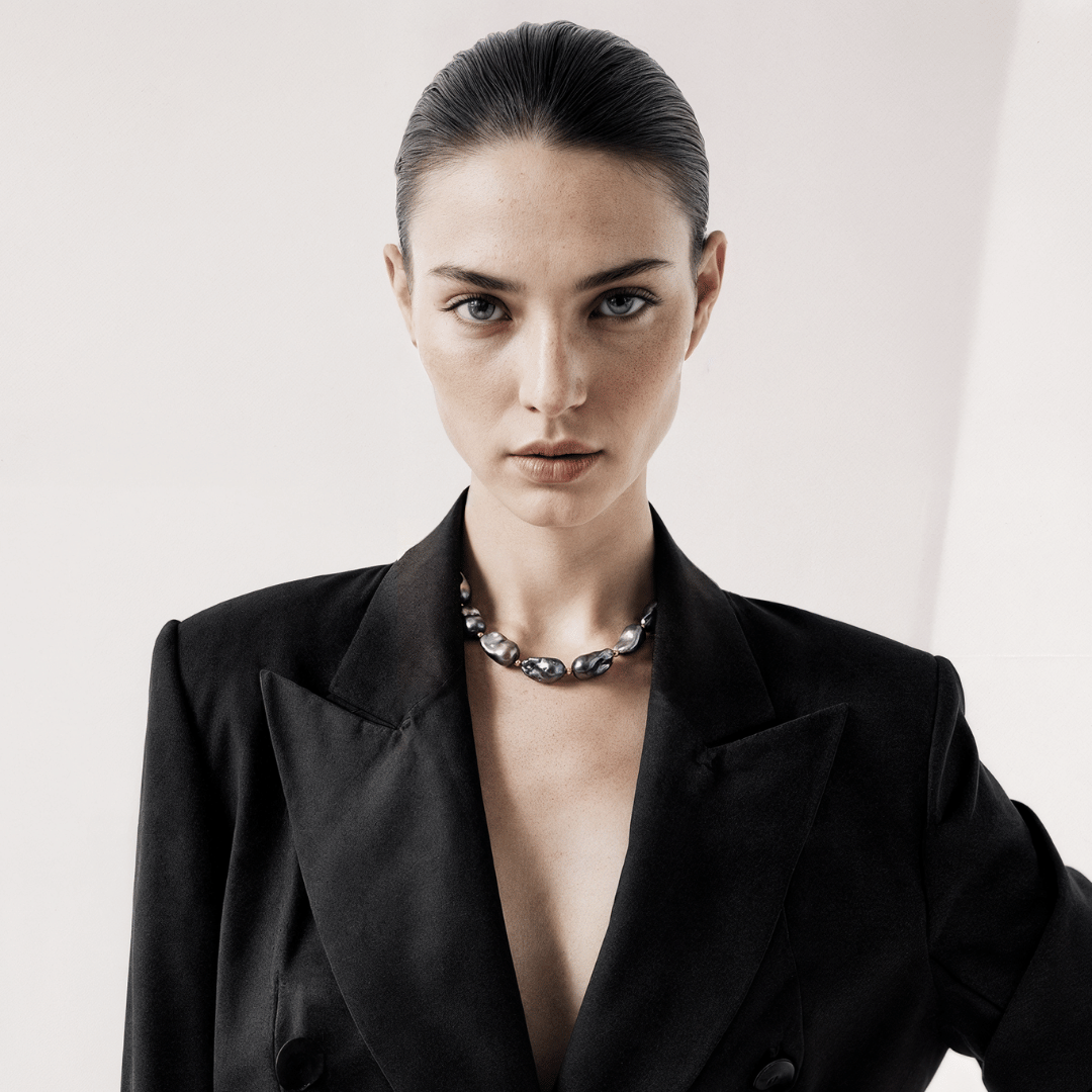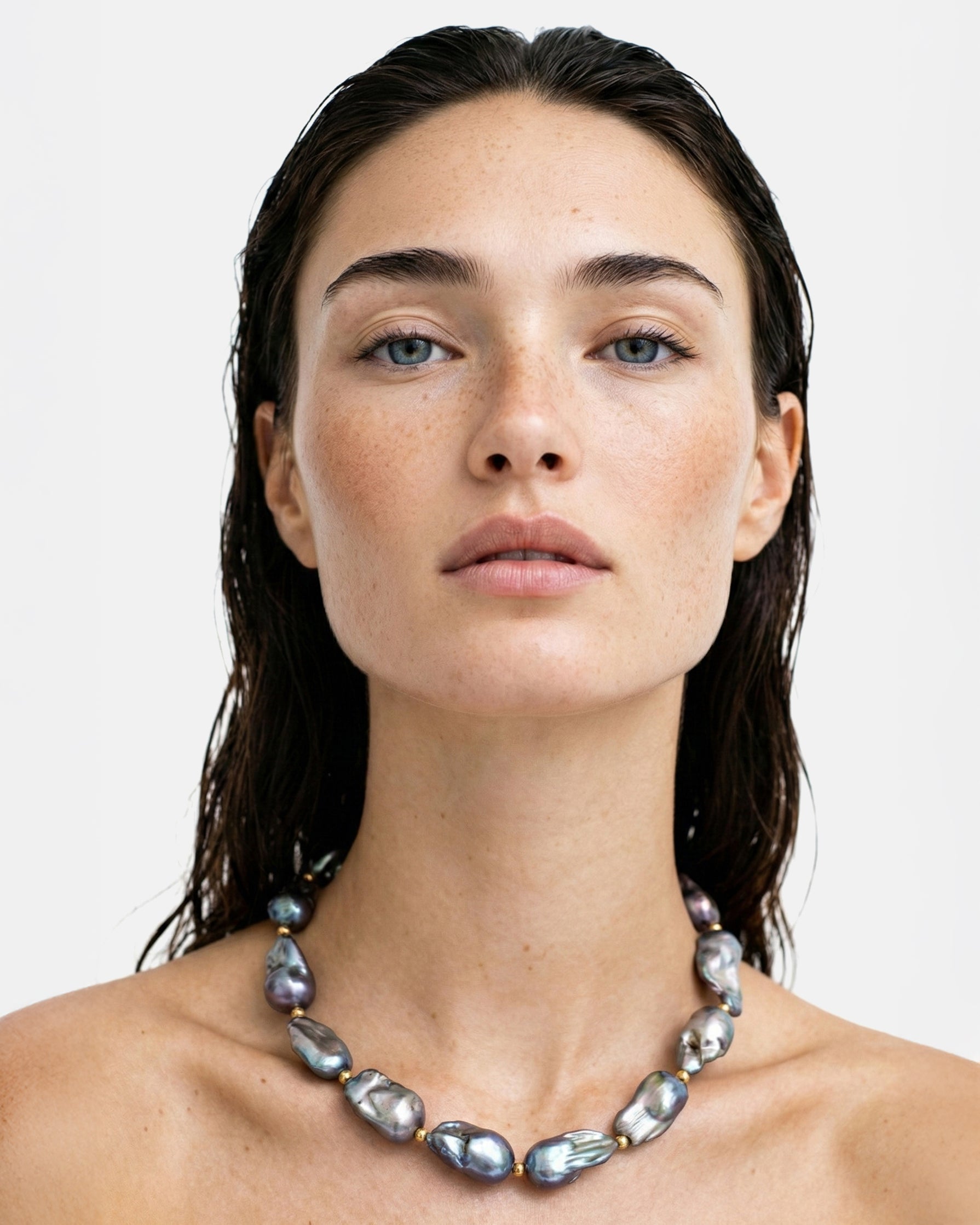 This exquisite choker is an ode to the primordial Greek goddess of the night. In mythology, Nyx was a figure of profound power and mysterious beauty, her veil shimmering with the stars of the cosmos. Each pearl is a genuine freshwater baroque pearl, hand-selected for its unique, organic form and deep, iridescent lustre. Like a galaxy captured in the dark, they flash with 'peacock' hues of violet, green, and deep blue, embodying the mystery of the midnight sky.